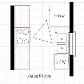 In general, the galley or corridor kitchen is commonly designed for a single cook or for small spaces. But if the distance between the two counters is somewhat wider than a traditional galley kitchen (which is often 3 to 3-1/2 feet from counter front to counter front) say perhaps 5 feet and if additionally, one wall is all or partially open this kitchen layout design can accommodate more than one cook. By opening one wall, seating can be created on the other side of the open counter.