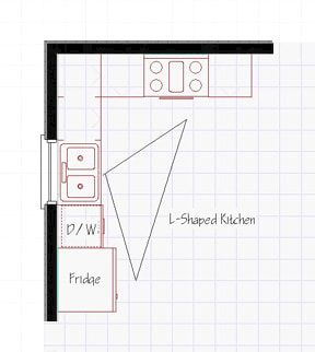 The L-shaped kitchen works well for small spaces and open floor plans. The work triangle is an efficient one. A table on the open side of this type of kitchen can make for a comfortable and casual feeling with room for guests and conversation. A table placed here can also be used for food preparation when required. This layout is commonly employed in a farmhouse kitchen where the food preparation and eating table are in the same room.