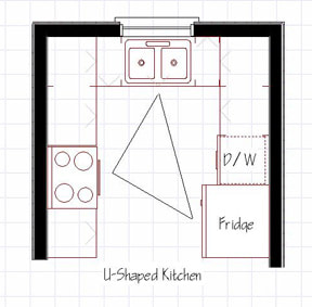 The U-shaped design also employs an efficient work triangle. This layout generally works well for one or two cooks but if the width of the U is narrow it is difficult to accommodate more people. If the U is too wide this kitchen becomes less efficient in terms of walking distance from each point of the working triangle. A variation of this layout is where one or part of a wall is open to form a pass-through counter or peninsula counter (in this image it could be open between the fridge and the sink wall).